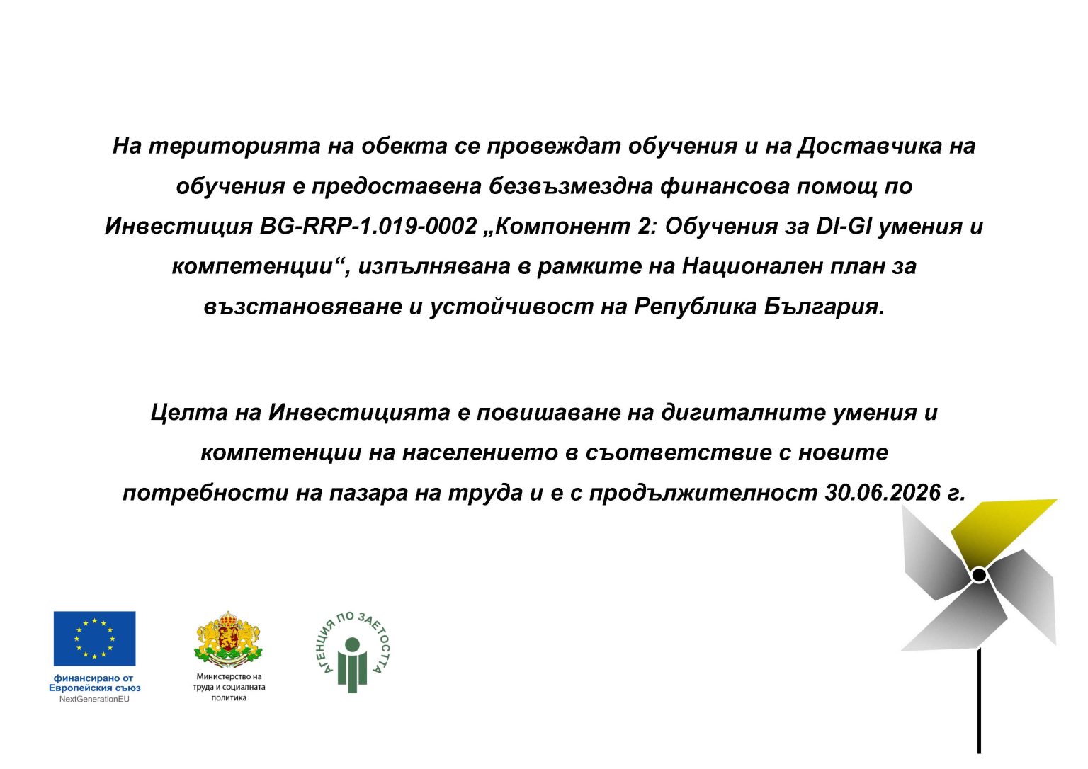 Обученията по КК4 „Цифрова компетентност“ се финансират по Компонент 2 „Обучения за DI-GI умения и компетенции“ от Инвестиция C1.I3 – П3 „Предоставяне на обучения за дигитални умения и създаване на платформа за обучение на възрастни“, изпълнявани по линия на Националния план за възстановяване и устойчивост.