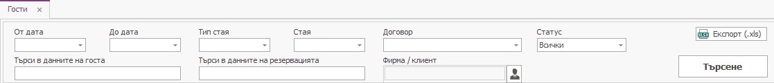 - Търсене в данните на госта – свободен текст по име, телефон, ЕГН, имейл.